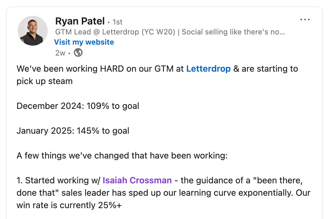 I work with many founders, CEOs, sales leaders, and VCs to build better sales machines.Sales narrative design: refine literally exactly what you and your team should say to sell your product better (as the first sales hire/eventually CRO at Tropic I went through this process many times)Founder led sales: 1:1 coaching and call reviewsPlaybook design: pretty much what it sounds likeTalent evaluations and hiring support: assessment of current team, hiring process design, candidate interviewing